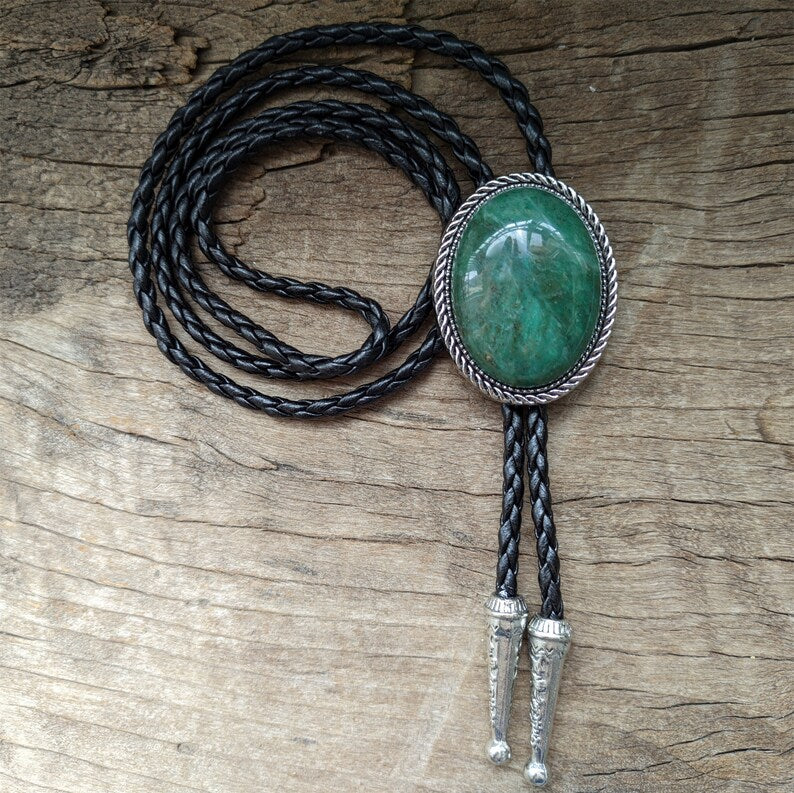 Green Jade Bolo Tie: Western Cowboy Silver-Plated Necklace