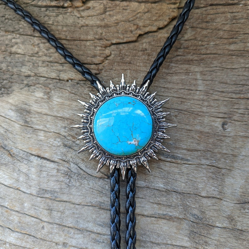 Turquoise Sun Bolo Tie: Silver-Plated Western Cowboy Necktie